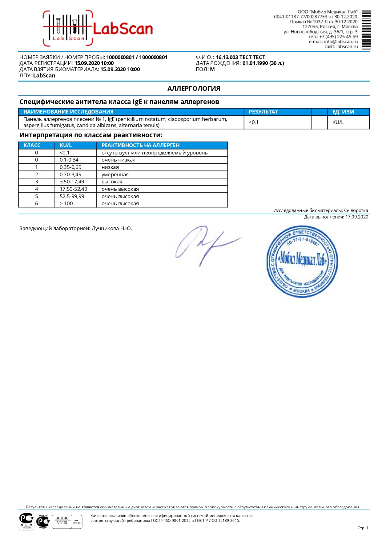 Панель аллергенов плесени № 1, IgE (penicillium notatum, cladosporium herbarum, aspergillus fumigatus, candida albicans, alternaria tenuis)