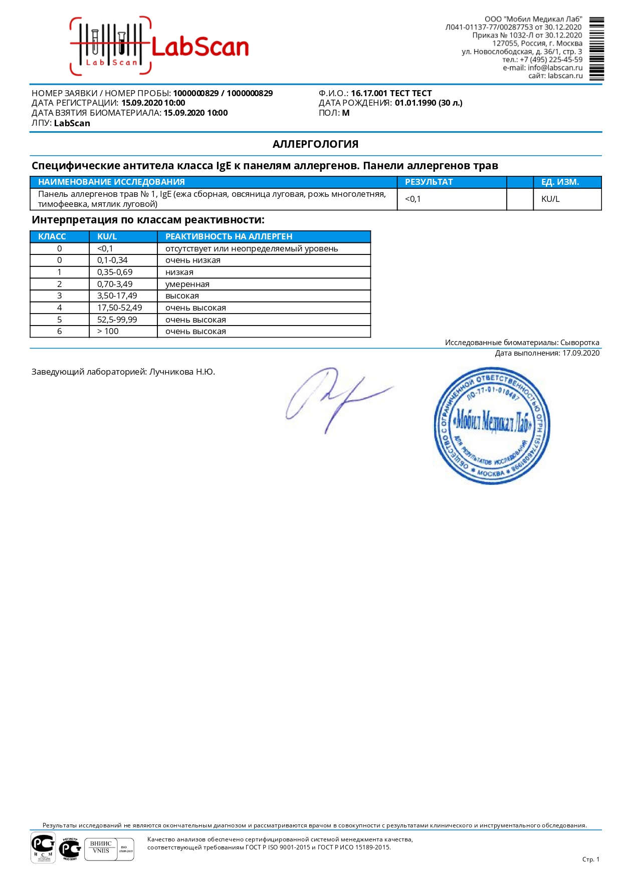 Панель аллергенов трав № 1, IgE (ежа сборная, овсяница луговая, рожь многолетняя, тимофеевка, мятлик луговой)