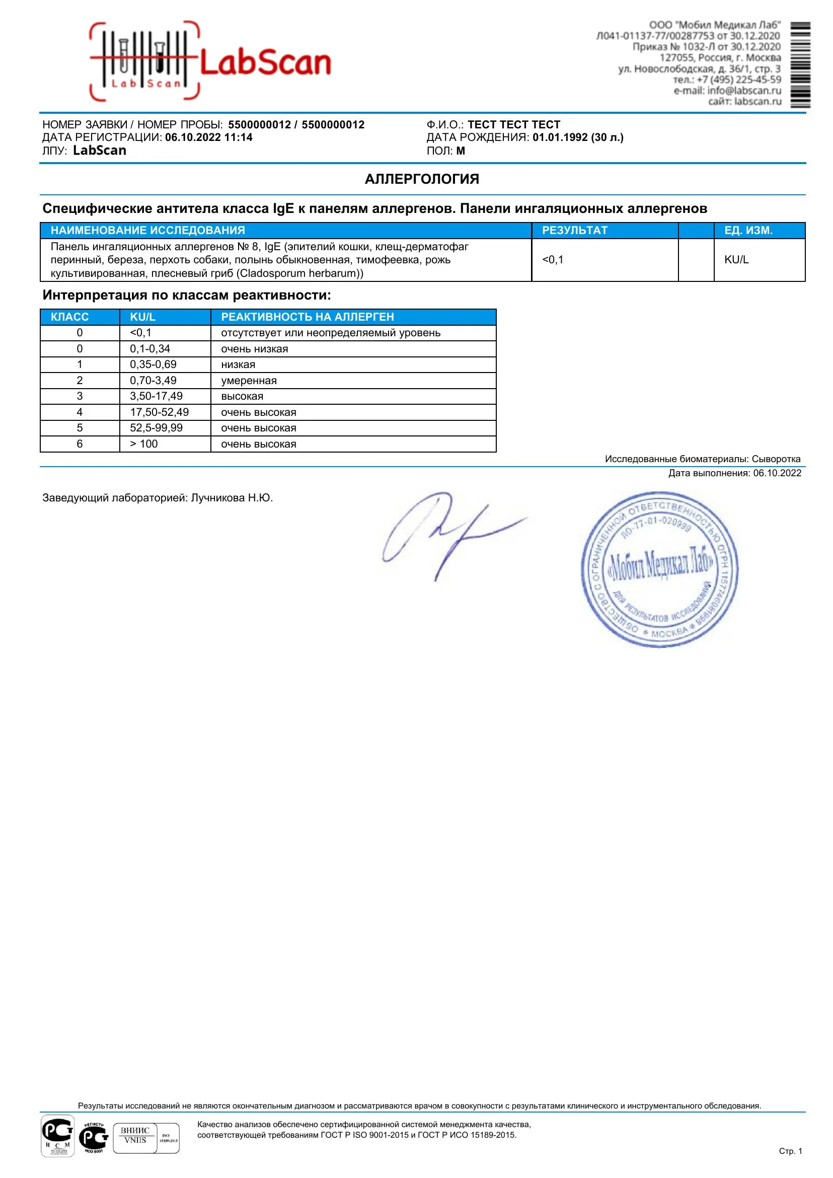 Панель ингаляционных аллергенов № 8, IgE (эпителий кошки, клещ-дерматофаг перинный, береза, перхоть собаки, полынь обыкновенная, тимофеевка, рожь культивированная, плесневый гриб (Cladosporum herbarum))