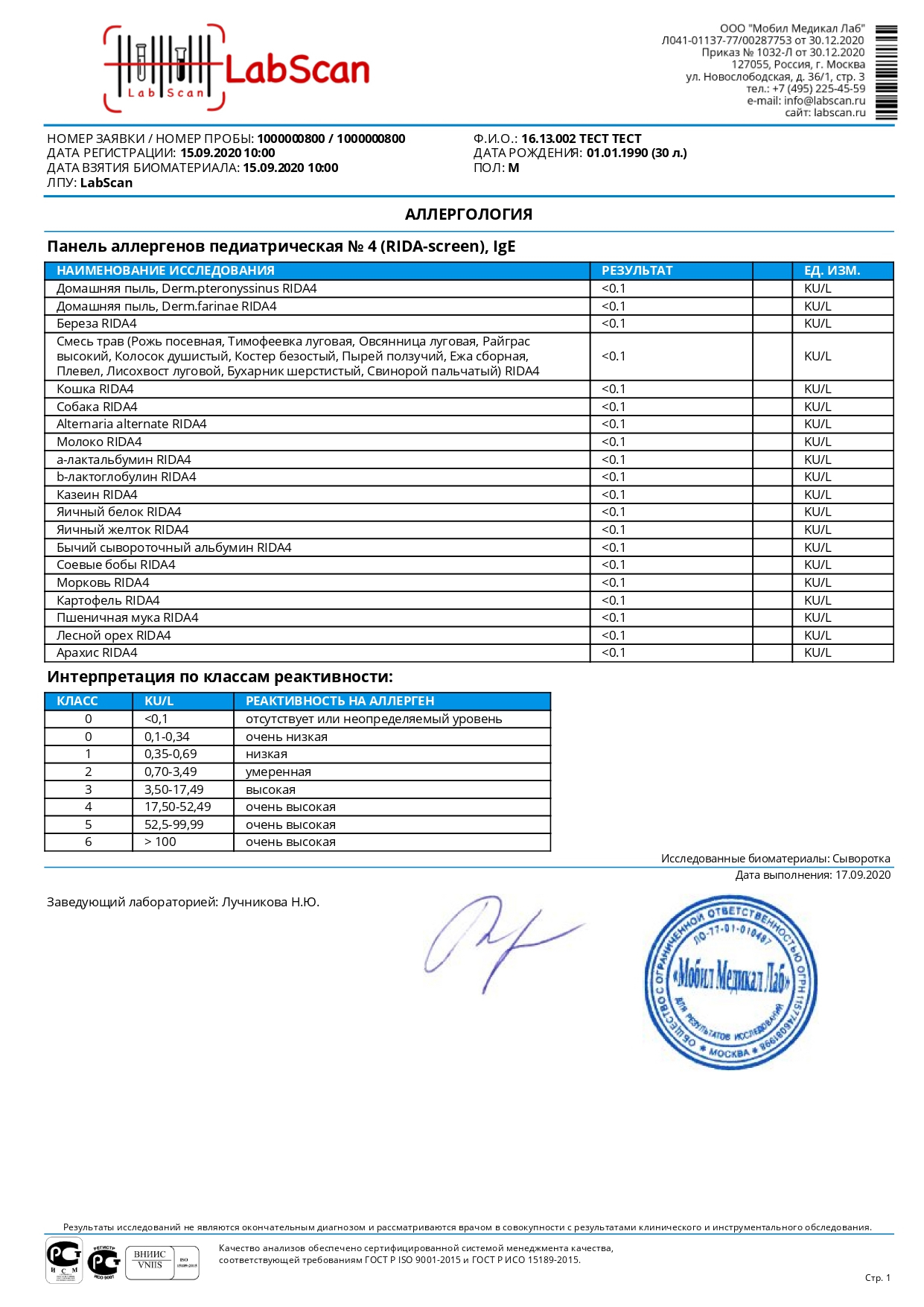 Панель аллергенов педиатрическая № 4, IgE (аналог RIDA)