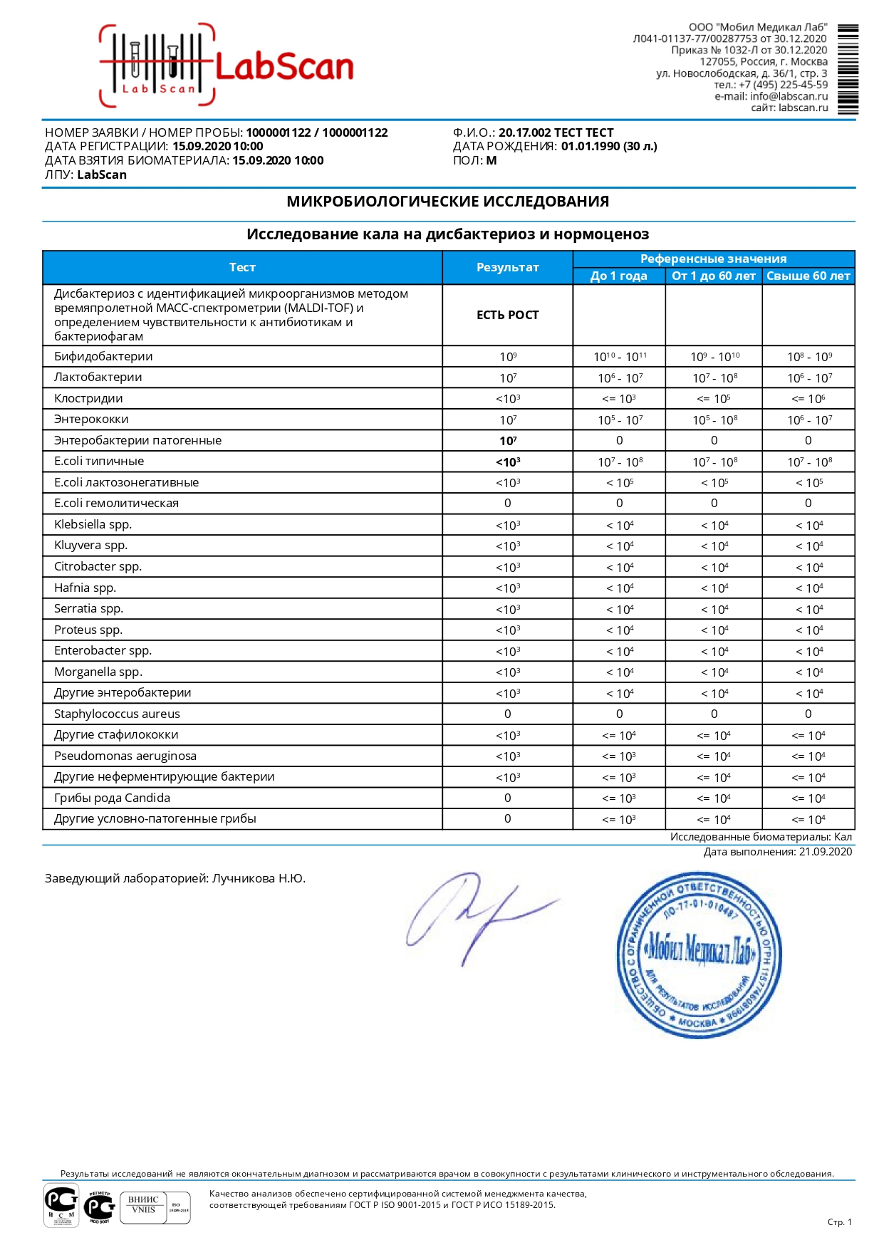 Дисбактериоз с идентификацией микроорганизмов методом времяпролетной МАСС-спектрометрии (MALDI-TOF) и определением чувствительности к антибиотикам и бактериофагам