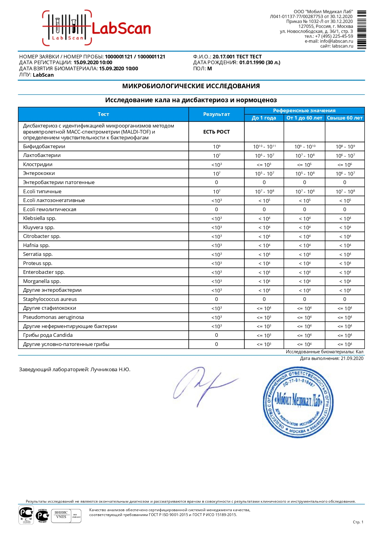 Дисбактериоз с идентификацией микроорганизмов методом времяпролетной МАСС-спектрометрии (MALDI-TOF) и определением чувствительности к бактериофагам