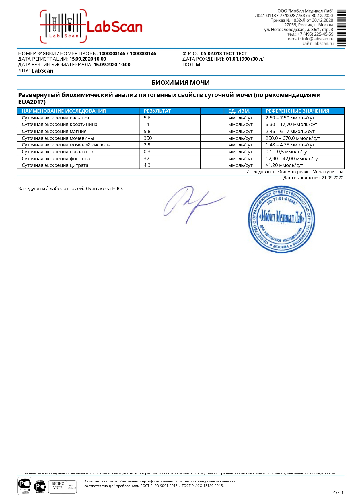 Развернутый биохимический анализ литогенных свойств суточной мочи (по рекомендациями EUA2017)
