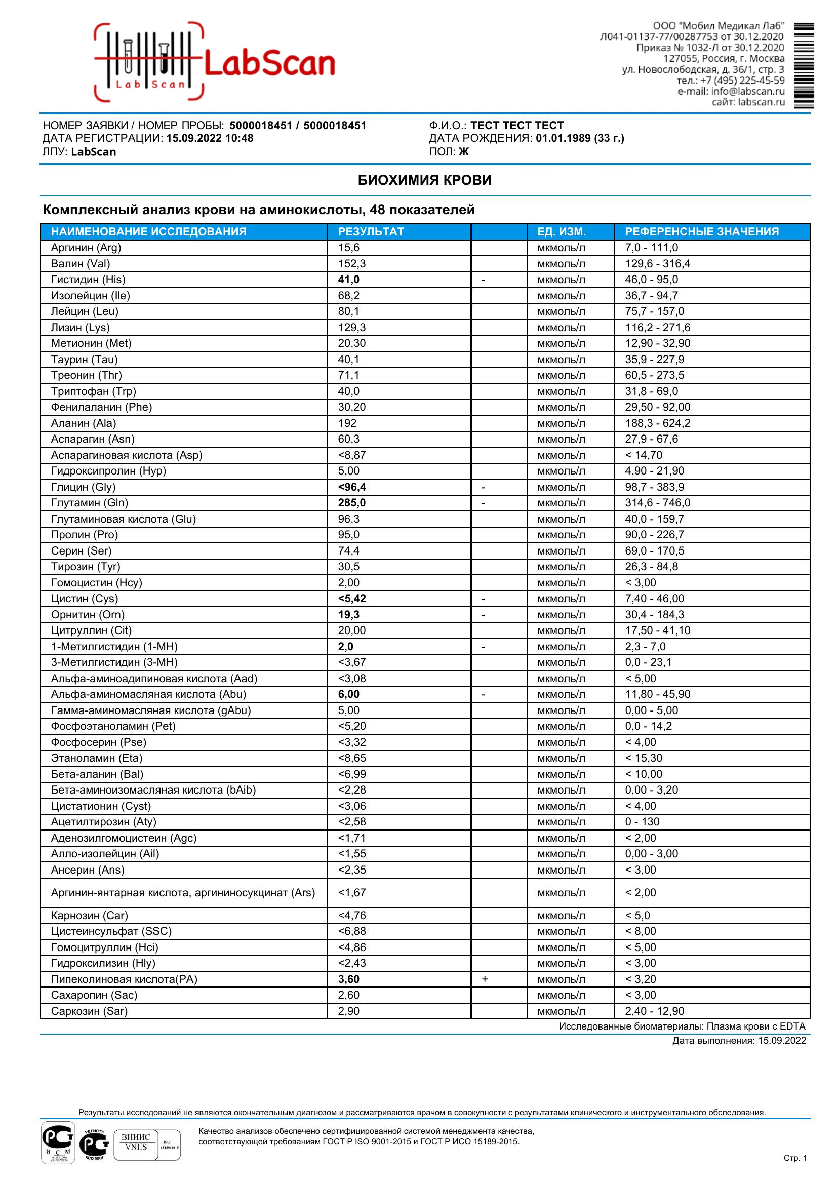Результаты анализа предоставляются в виде количественных показателей для каждой аминокислоты. Врач оценивает результаты на предмет наличия отклонений от нормы: повышенный уровень аминокислот: может свидетельствовать о нарушении метаболизма, заболеваниях печени, почек или других органов, а также о дефиците витаминов и ферментов, необходимых для их метаболизма. Пониженный уровень аминокислот: может указывать на недостаточное поступление аминокислот с пищей, проблемы с пищеварением или всасыванием, а также на катаболические состояния, такие как хронические заболевания, инфекции или стресс.