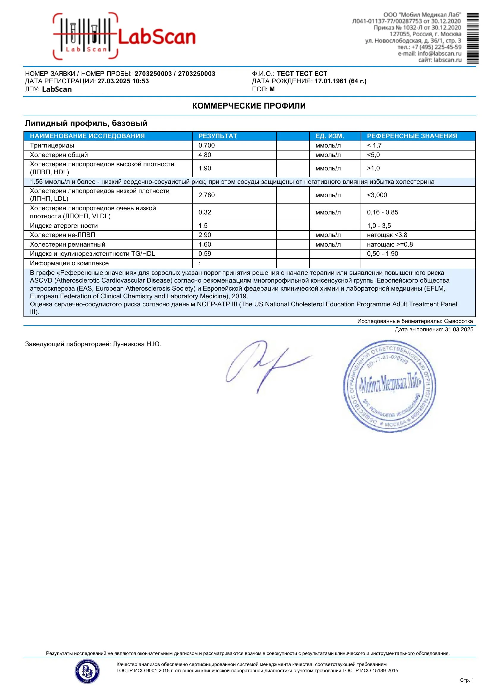 Комплекс Липидный профиль, базовый с дополнительной скидкой за 780 руб.