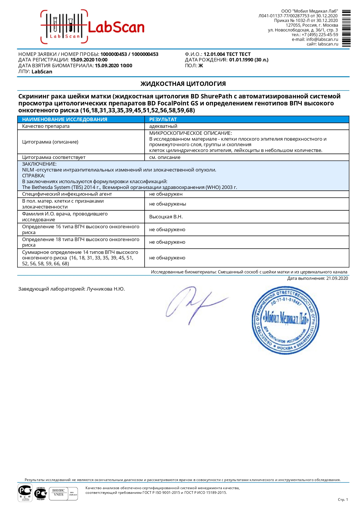 Скрининг рака шейки матки (жидкостная цитология BD ShurePath с автоматизированной системой просмотра цитологических препаратов BD FocalPoint GS и определением генотипов ВПЧ высокого онкогенного риска (16,18,31,33,35,39,45,51,52,56,58,59,68)