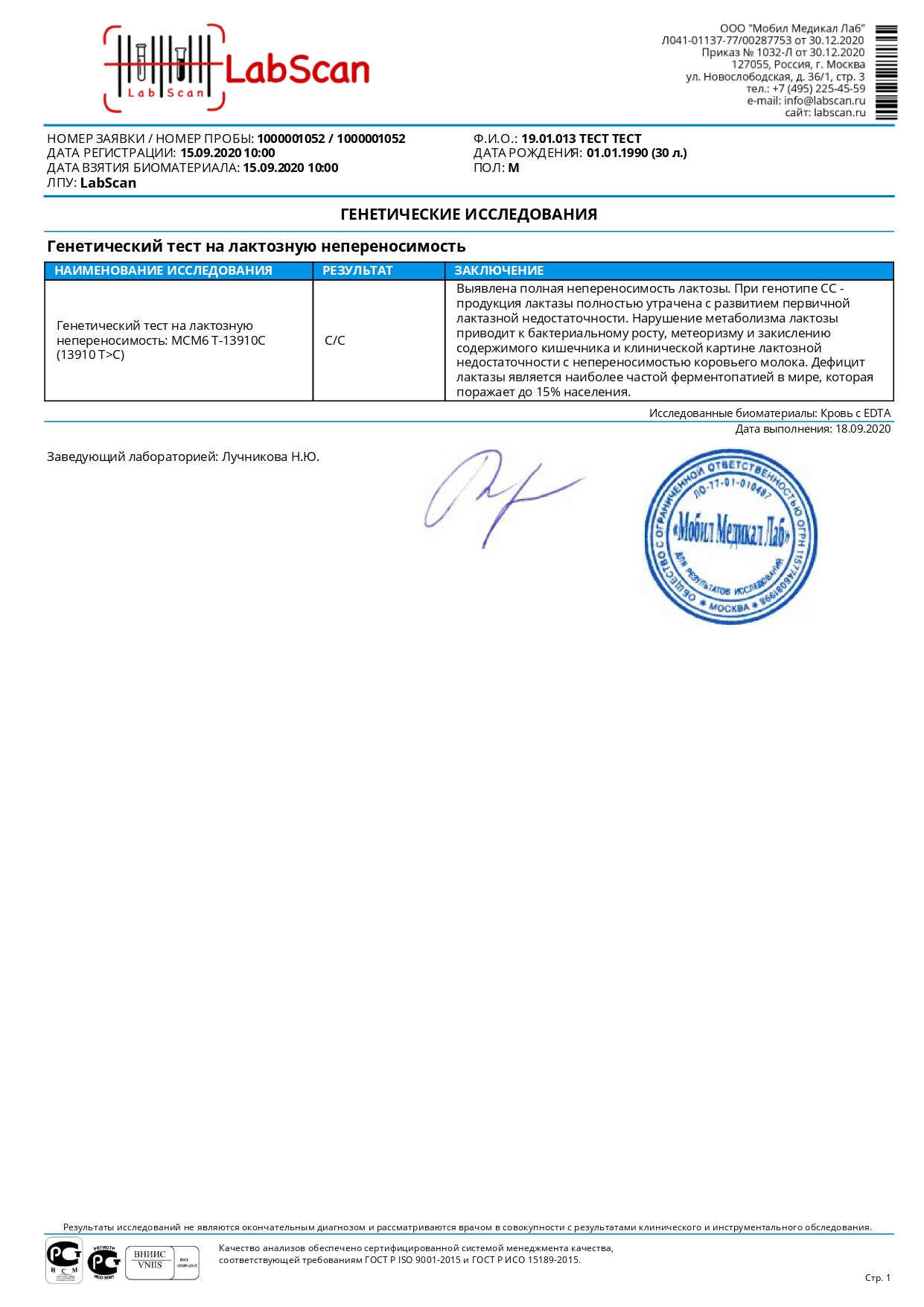 Генетический тест на лактозную непереносимость