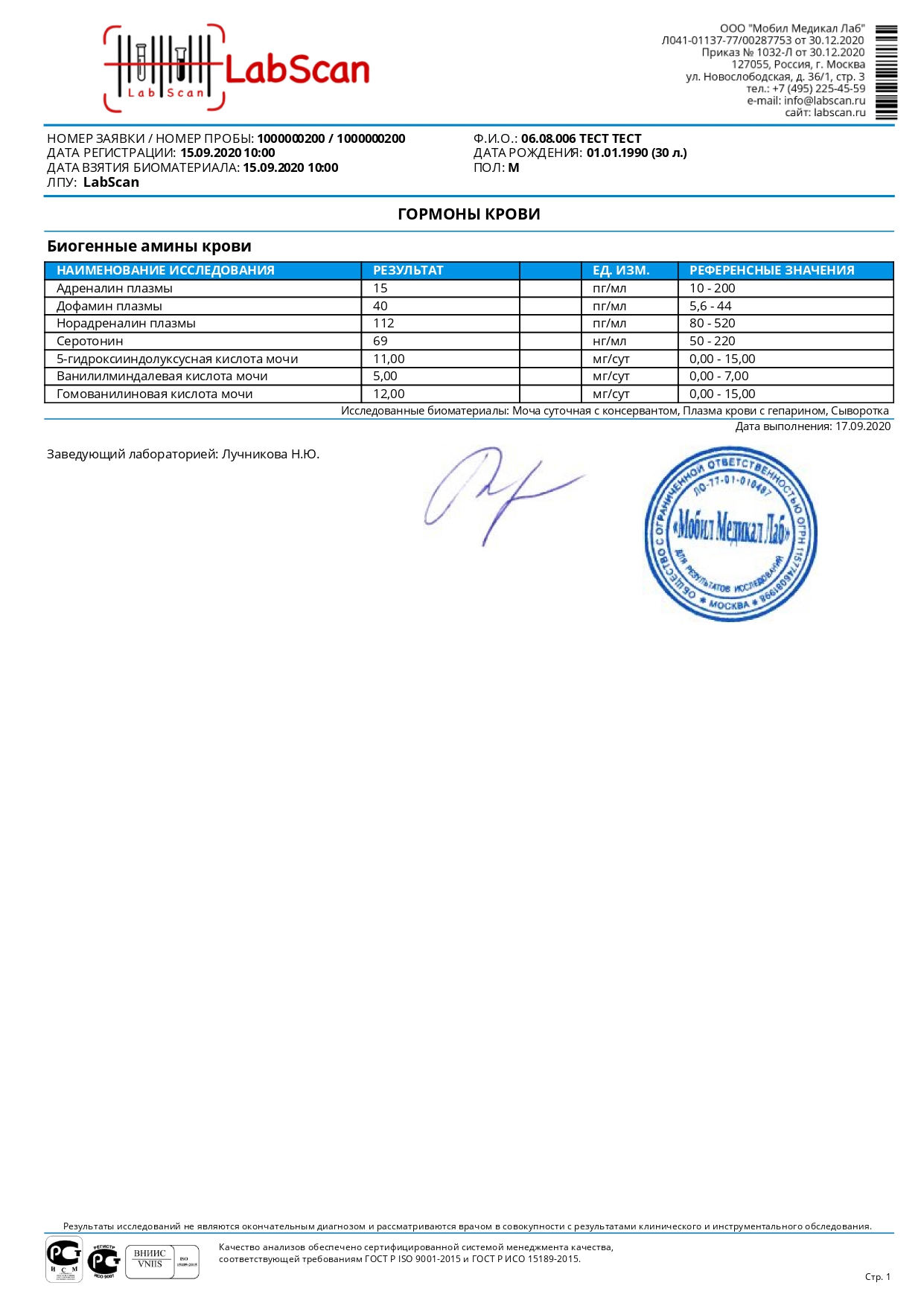 Биогенные амины: адреналин, норадреналин, дофамин, серотонин - в крови и их метаболиты в моче (ванилилминдальная кислота, гомованилиновая кислота, 5-гидроксииндолуксусная кислота)