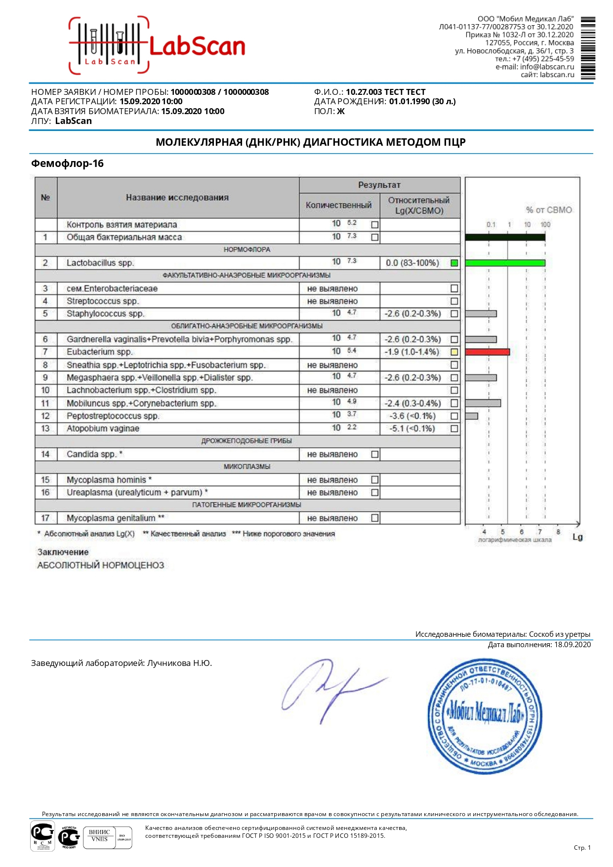 Комплексная оценка биоценоза проводится методом ПЦР. Результаты клинического исследования представлены в виде таблицы. В ней приведено соотношение нормальных и условно-патогенных микроорганизмов с общей бактериальной массой.