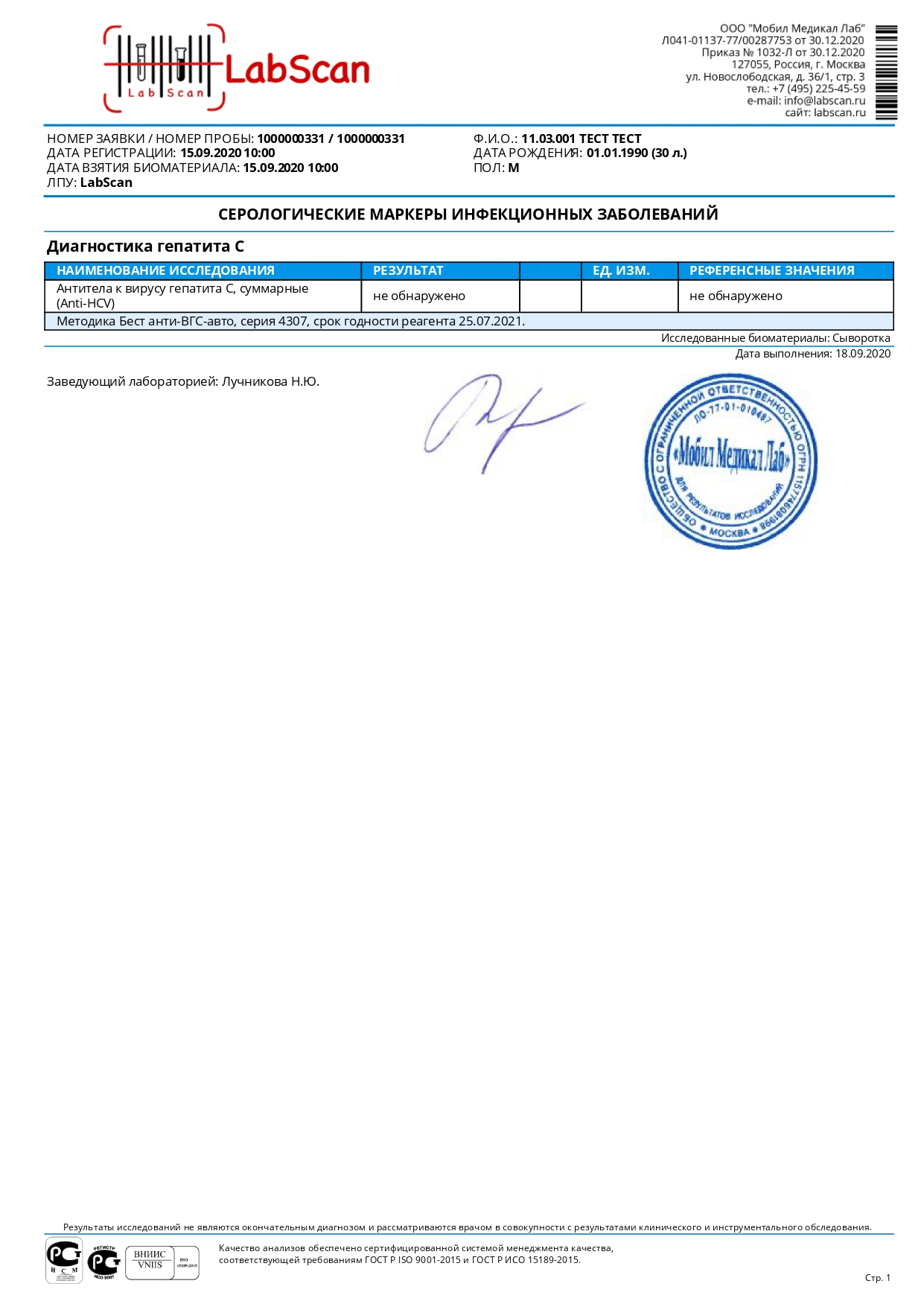 Антитела к вирусу гепатита С, суммарные (Anti-HCV) (метод ИФА)