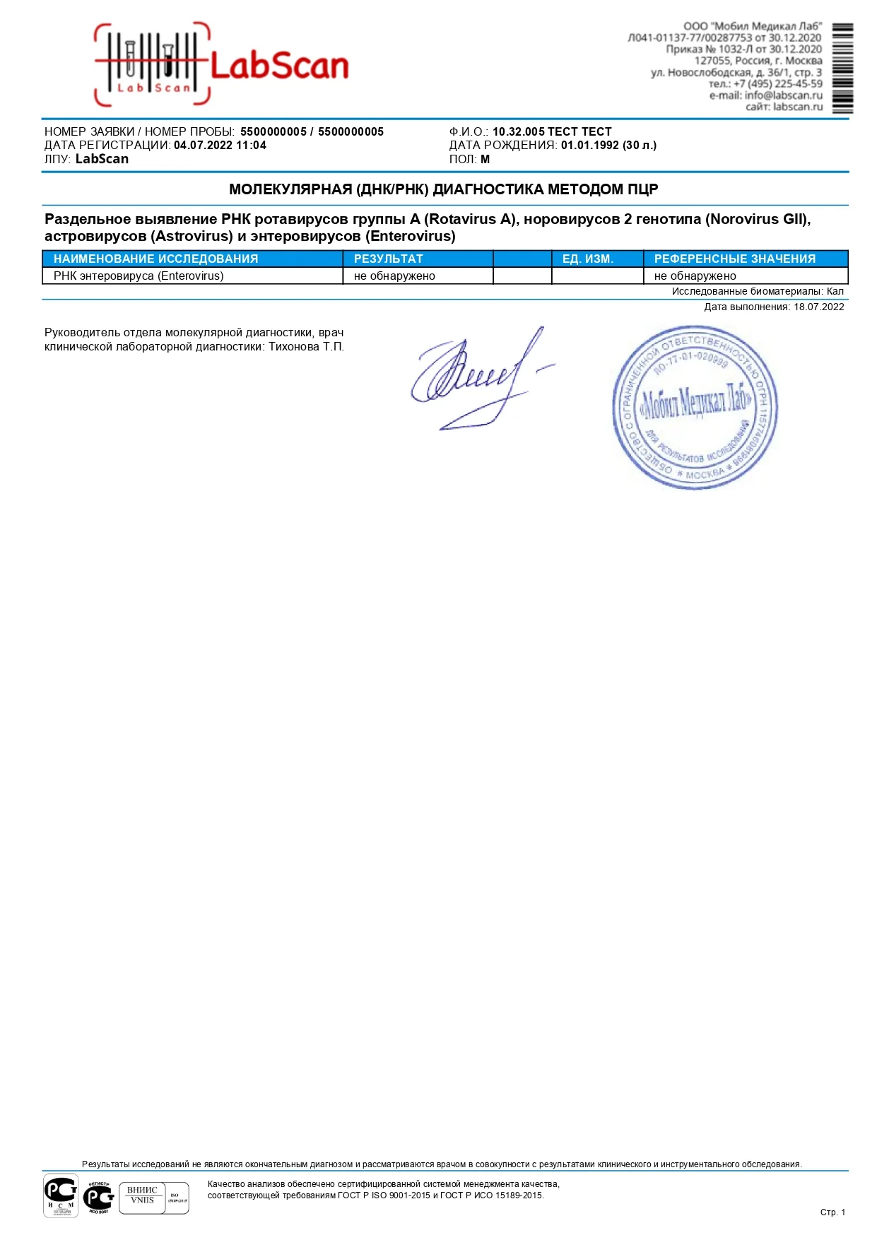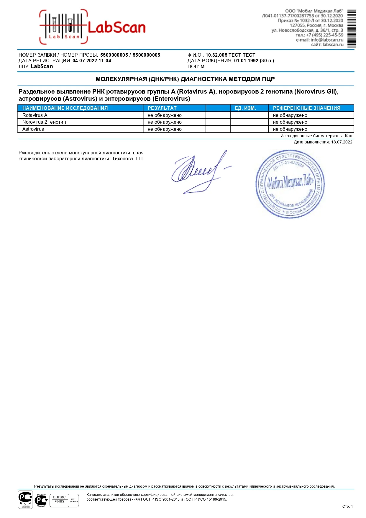 Раздельное выявление РНК ротавирусов группы А (Rotavirus A), норовирусов 2 генотипа (Norovirus GII), астровирусов (Astrovirus) и энтеровирусов (Enterovirus)