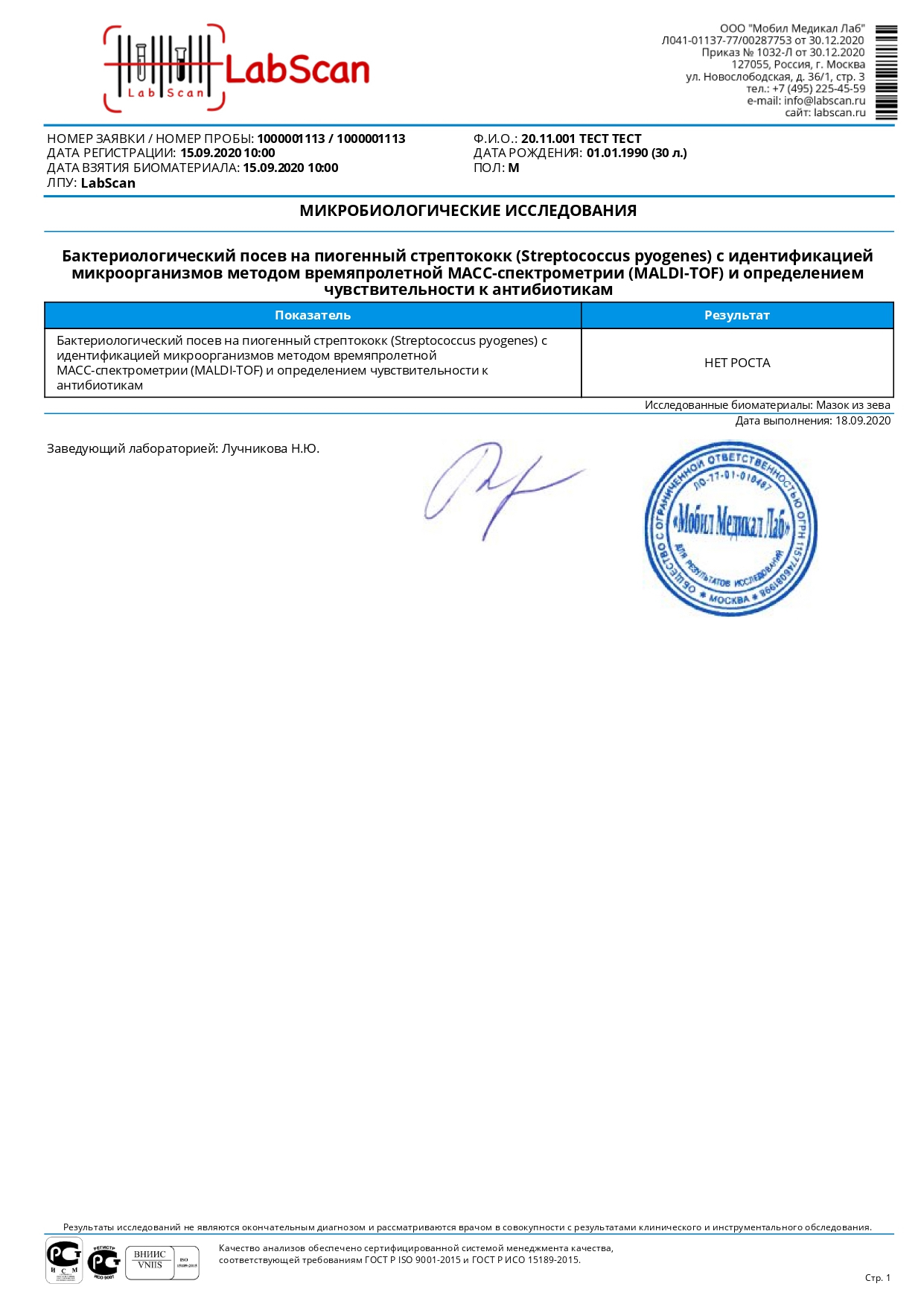 Бактериологический посев на пиогенный стрептококк (Streptococcus pyogenes) с идентификацией микроорганизмов методом времяпролетной МАСС-спектрометрии (MALDI-TOF) и определением чувствительности к антибиотикам