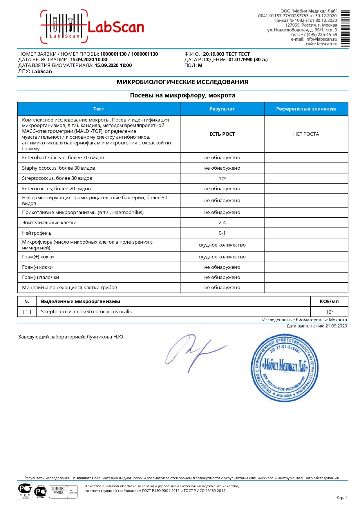 Комплексное исследование мокроты. Посев и идентификация микроорганизмов методом времяпролетной МАСС-спектрометрии (MALDI-TOF), определение чувствительности к основному спектру антибиотиков, бактериофагам и микроскопия с ок