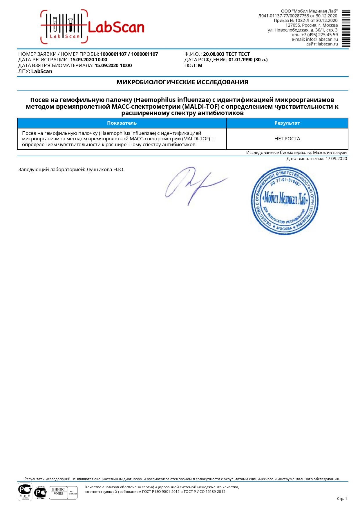 Посев на гемофильную палочку (Наemophilus influenzae) с идентификацией микроорганизмов методом времяпролетной МАСС-спектрометрии (MALDI-TOF) с определением чувствительности к расширенному спектру антибиотиков