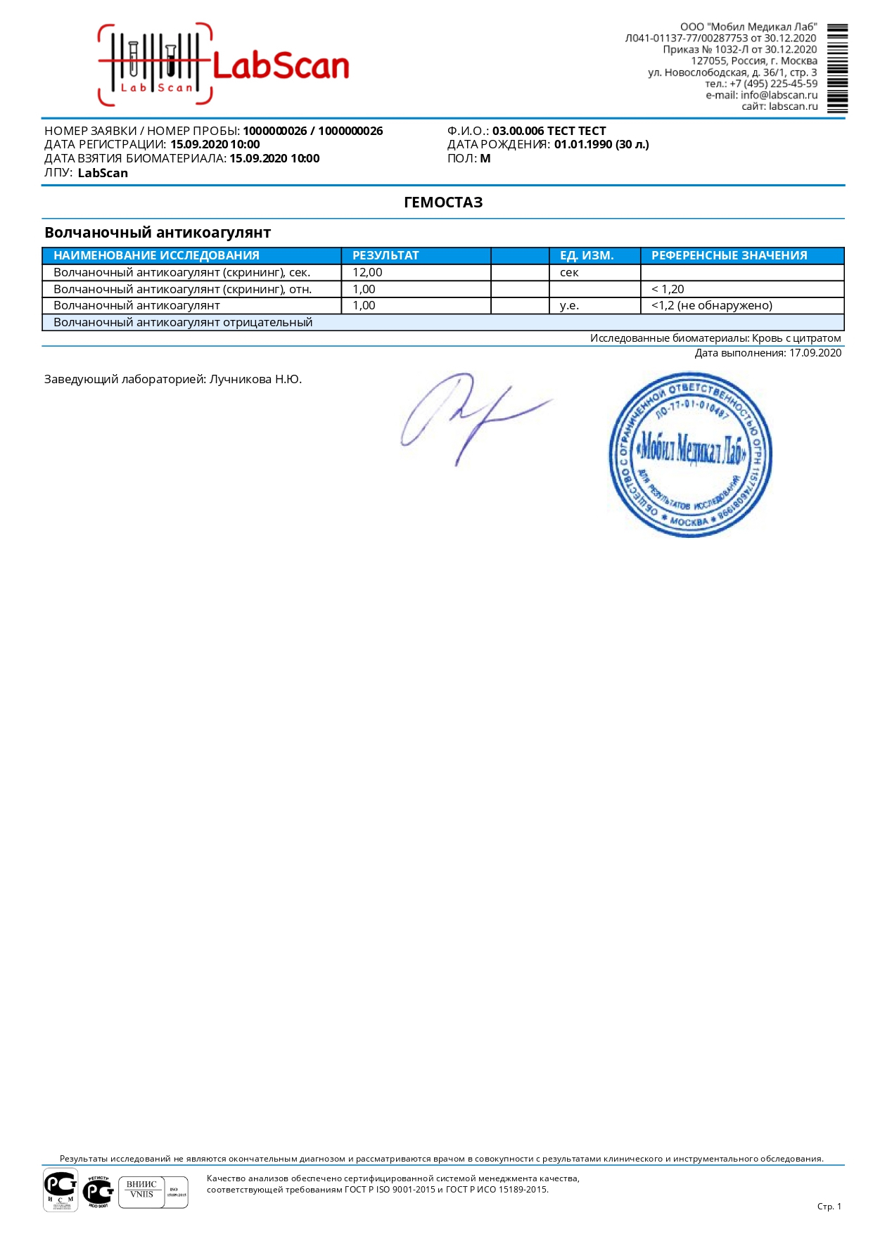 Волчаночный антикоагулянт (скрининг)